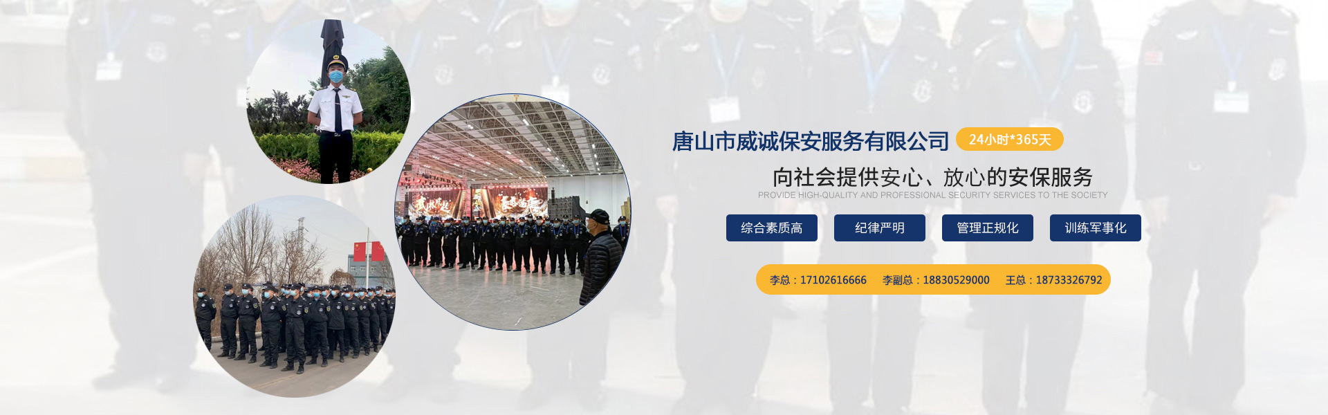 唐山市威誠保安服務有限公司自成立以來以“嚴防死守、忠于業主”為服務原則,以“客戶滿意、 合作共贏”為根本目標。以科學的管理、多方位多層次的服務,建立了首問責任制,完善了走訪、回訪 、滿意度調查、末位淘汰的預警管理,不斷提高服務質量,提高業主滿意度,提高企業形象。秉承“誠 實守信,紀律嚴明,團結協作,致精致誠”的服務理念,為客戶提供高品質、多方位、專業化的保安服務。 本公司制定了嚴謹的定向招生、崗前培訓、考核錄用、崗中培訓、持續(xù)培訓、末位淘汰制等一整套完善的管理體系。可以根據客戶的要求實地勘察評估,以量身定做的方式提供安保防范服務。